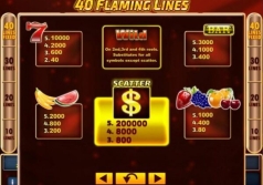 Apart from the regular tiles, at 40 Flaming Lines, we have a bonus loaded symbol. It looks like a Dollar sign and it is signed Scatter. Scatters may look like regular pay tiles, but actually they are loaded with hot possibilities. When you Play this slot which is called 40 Flaming Lines, the combination of 5 scatters will be worth 20,000 times the bet.
