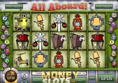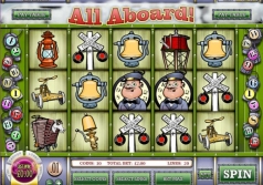 All Aboard has twenty paylines and five reels. Play symbols are railroad crossings, handcars, lanterns, old-styled railway carriages, cars with a horse, water towers, conductors, train whistles and railroad spikes. Apart from regular pay symbols, there are also Wilds that look like steam locomotives, Casey Jones scatter symbols and a Bonus Bell symbol.