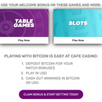 Café Casino offers two welcome promos. One for regular punters and the other one for those who prefer paying in BTC. The regular cash bonus comes in two variants. The first one is the Super Play Welcome Bonus. It’s a 500% match up to $5,000 on the first deposit. It comes with a 10x max cashout, 35x playthrough, and the bonus itself is cashable. The second variant is called the No-Max Welcome Bonus. It’s a 100% matching bonus of up to $1,000 on the first deposit. It comes with no max cashout, 25x playthrough, and the bonus itself is cashable.