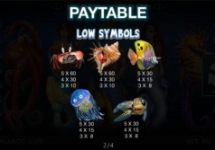 Paysymbols here are all sorts of sea creatures. We have two different Mermaids: a long-haired brunette is worth 100x your bet, while the short-haired one is worth only 90x the bet, both for the set of five. Five Seahorses, Sea Kings or Octopuses will get your line bet multiplied 80 times. Those are considered high-paid symbols. As for the low paid once, those are mainly fish. A set of five Crabs or Clownfish with a Conch Shell are worth 60 times your line bet. A set of five Angelfish or five Jellyfish or five little Sea turtles are worth 30 times your bet each.